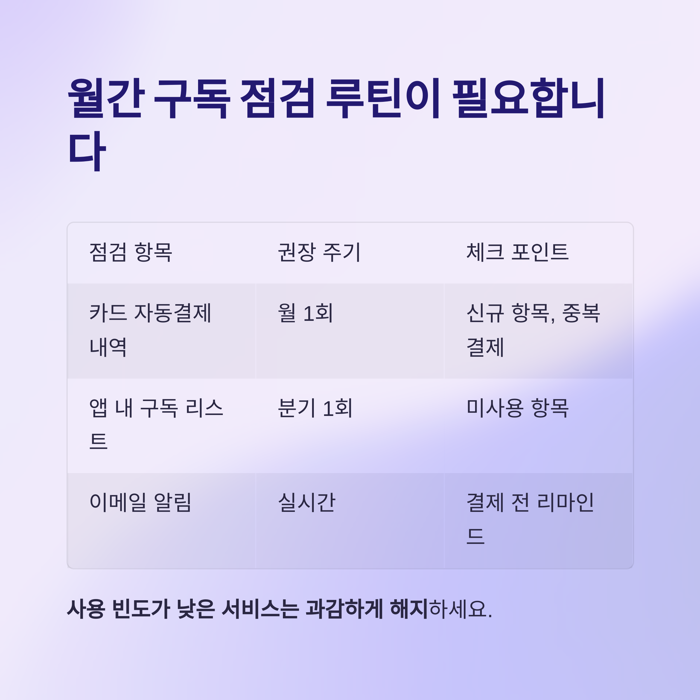 | 앱 내 구독 리스트 | 분기 1회 | 미사용 항목 |