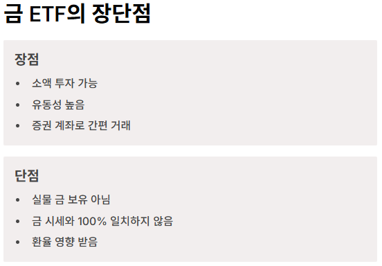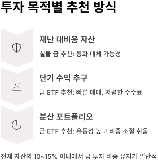 | 금 ETF | 소액 투자 가능, 유동성 높음 | 실물 금 보유 아님 |
