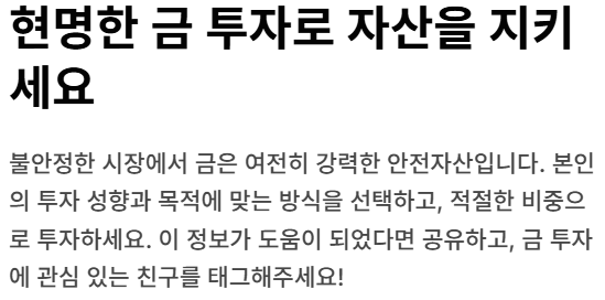 만약 이 시점에서 무리하게 실물 금을 대량 매입한다면, 향후 금리와 지정학적 리스크가 완화될 경우 조정에 따른 손실 가능성도 존재합니다.