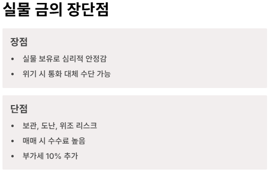 | 실물 금 | 실물 보유로 심리적 안정감 큼 | 보관, 도난, 위조 리스크 존재 |