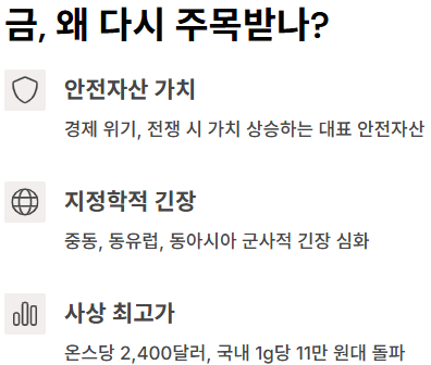 2024년 하반기부터 중동, 동유럽, 동아시아에서의 군사적 긴장이 심화되며 세계 금융시장이 불안정해졌고, 이에 따라 금값이 급격히 상승했습니다.