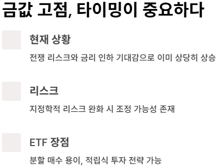 금 ETF는 그에 비해 분할 매수가 용이하고, 적립식 투자 전략도 가능하기 때문에 고점 논란이 있는 지금과 같은 시기에는 상대적으로 유연한 접근이 가능합니다.