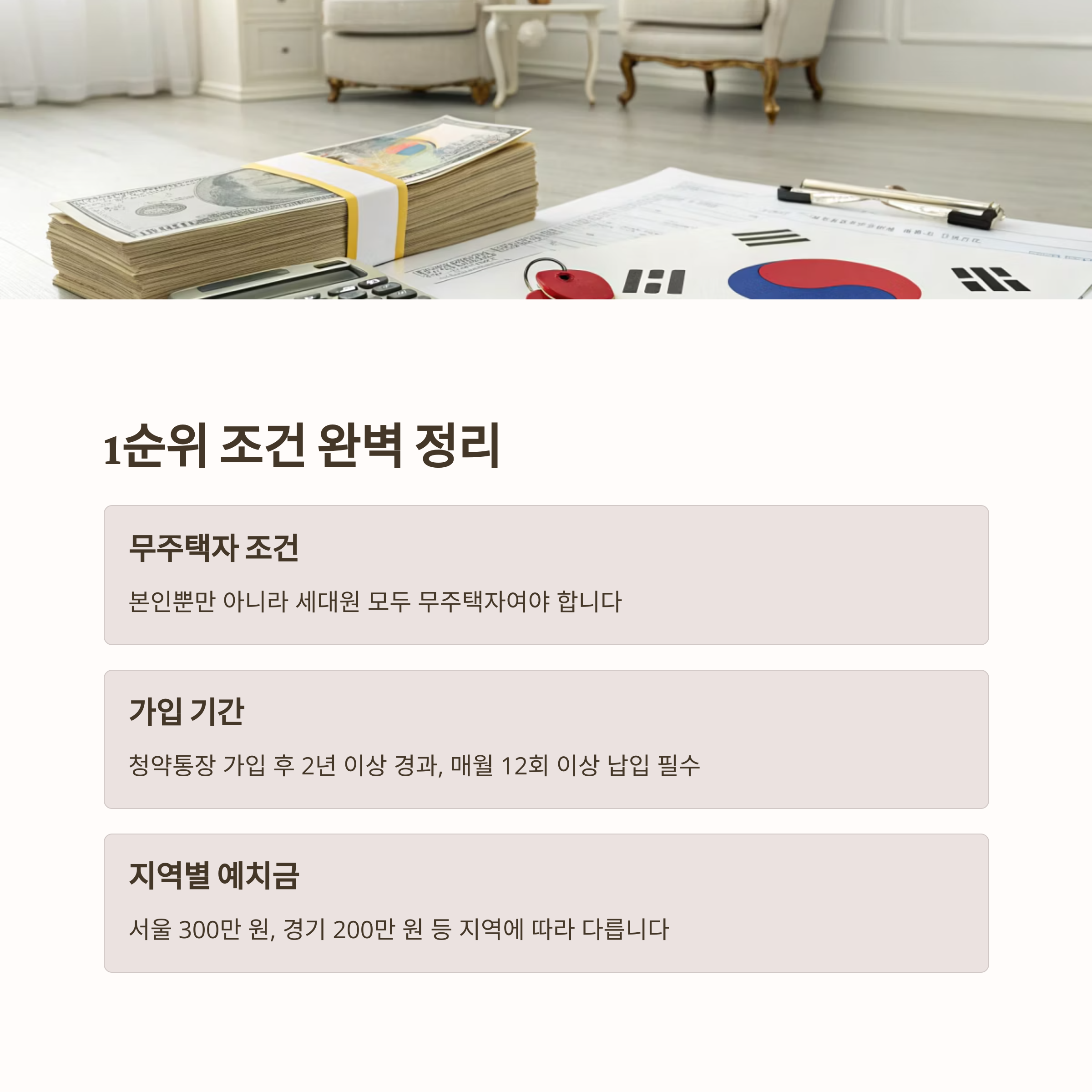 - 무주택 세대주여야 하며, 세대주로 1년 이상 등재되어야 1순위 자격이 됩니다.