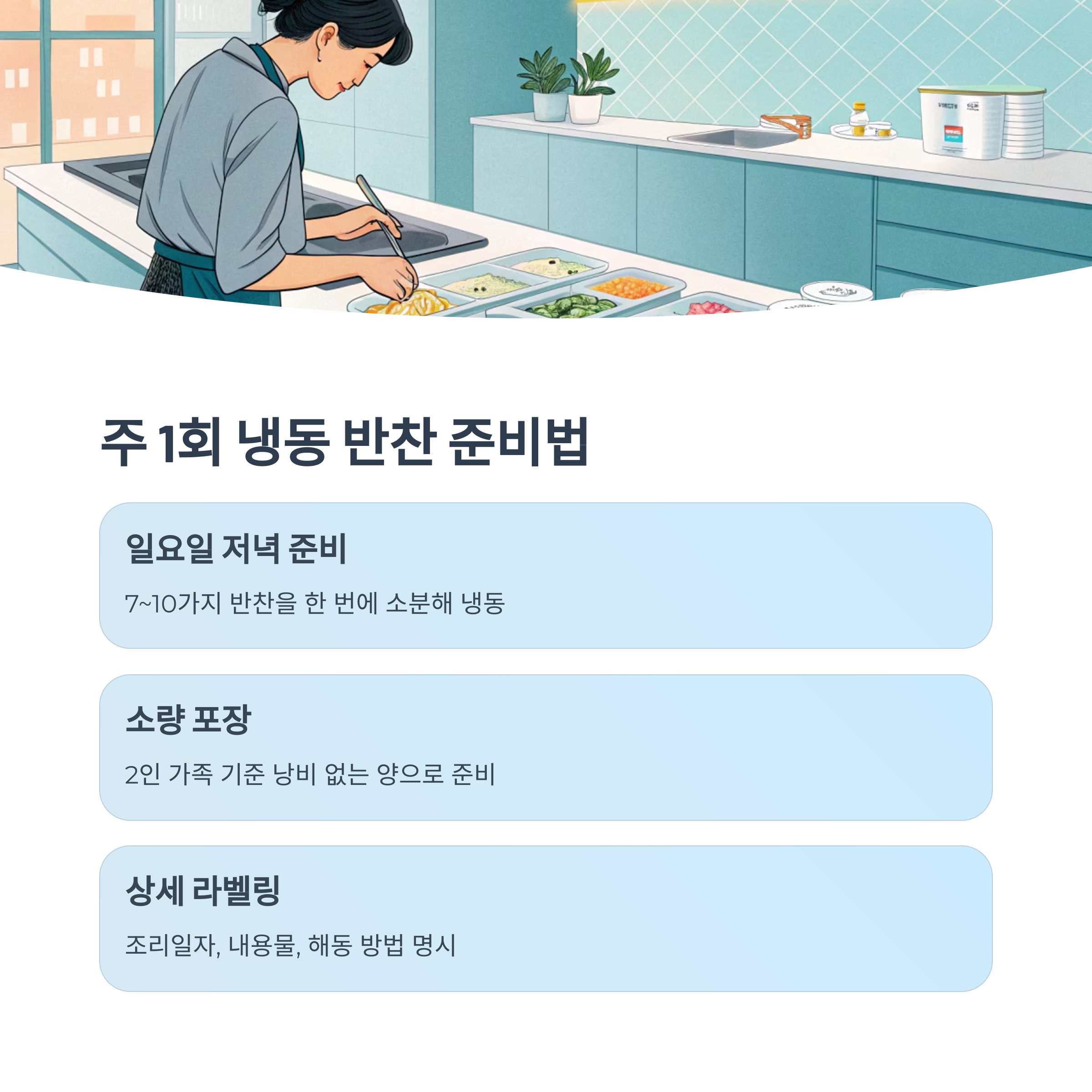식단표는 냉장고 앞에 붙여두고, 소진된 반찬은 주말에 다시 보충하세요.
