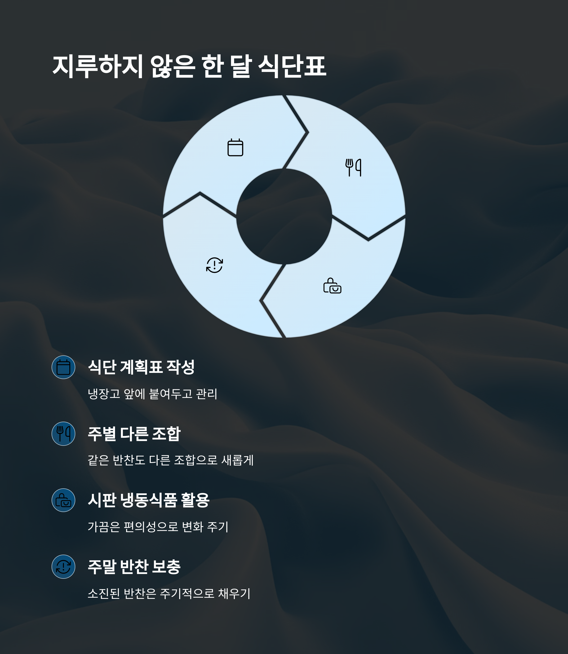 각 주마다 다른 반찬을 조합하고, 가끔은 시판 냉동식품이나 배달 메뉴로 변화를 주면 지루함도 덜합니다.