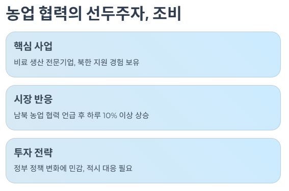 조비는 비료 생산을 전문으로 하는 기업으로, 과거에도 북한 비료 지원 소식이 나올 때마다 강한 주가 반응을 보였던 전력이 있습니다. 이번에도 남북 농업 협력 가능성이 언급되자 하루 만에 10% 넘는 상승을 기록했습니다.