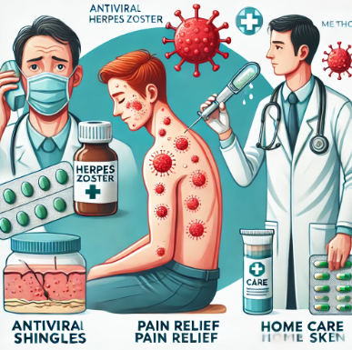 대상포진이 의심되면 가능한 한 빨리 병원을 방문해 항바이러스제를 처방받는 것이 중요합니다. 항바이러스제(아시클로버, 발라시클로버, 팜시클로버 등)는 바이러스 증식을 억제하고 증상을 완화하는 역할을 합니다. 발진이 발생한 후 72시간 이내에 복용하는 것이 가장 효과적입니다. - 진통제 및 소염제 사용