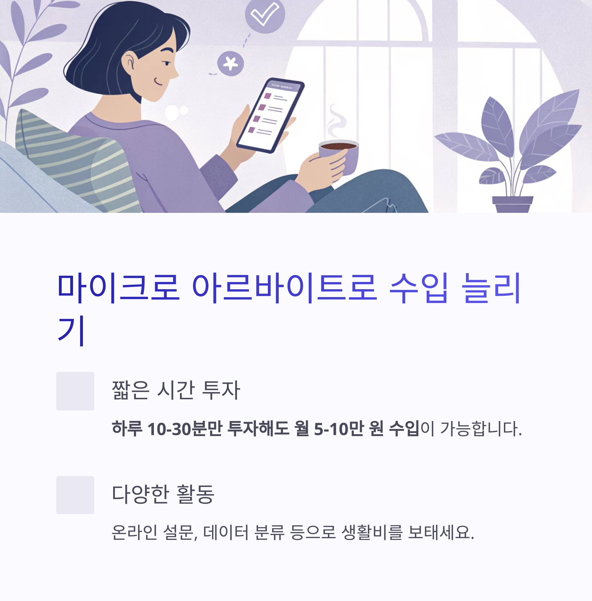 여유 시간에 짧게 할 수 있는 온라인 미션, 설문조사, 중고 거래, 데이터 라벨링 등을 통해 하루 10~30분만 투자해도 월 5~10만 원 수입이 가능할 수 있습니다. 물론 단시간 내 큰 돈은 아니지만, 꾸준히 하면 생활비 보탬이 됩니다.
