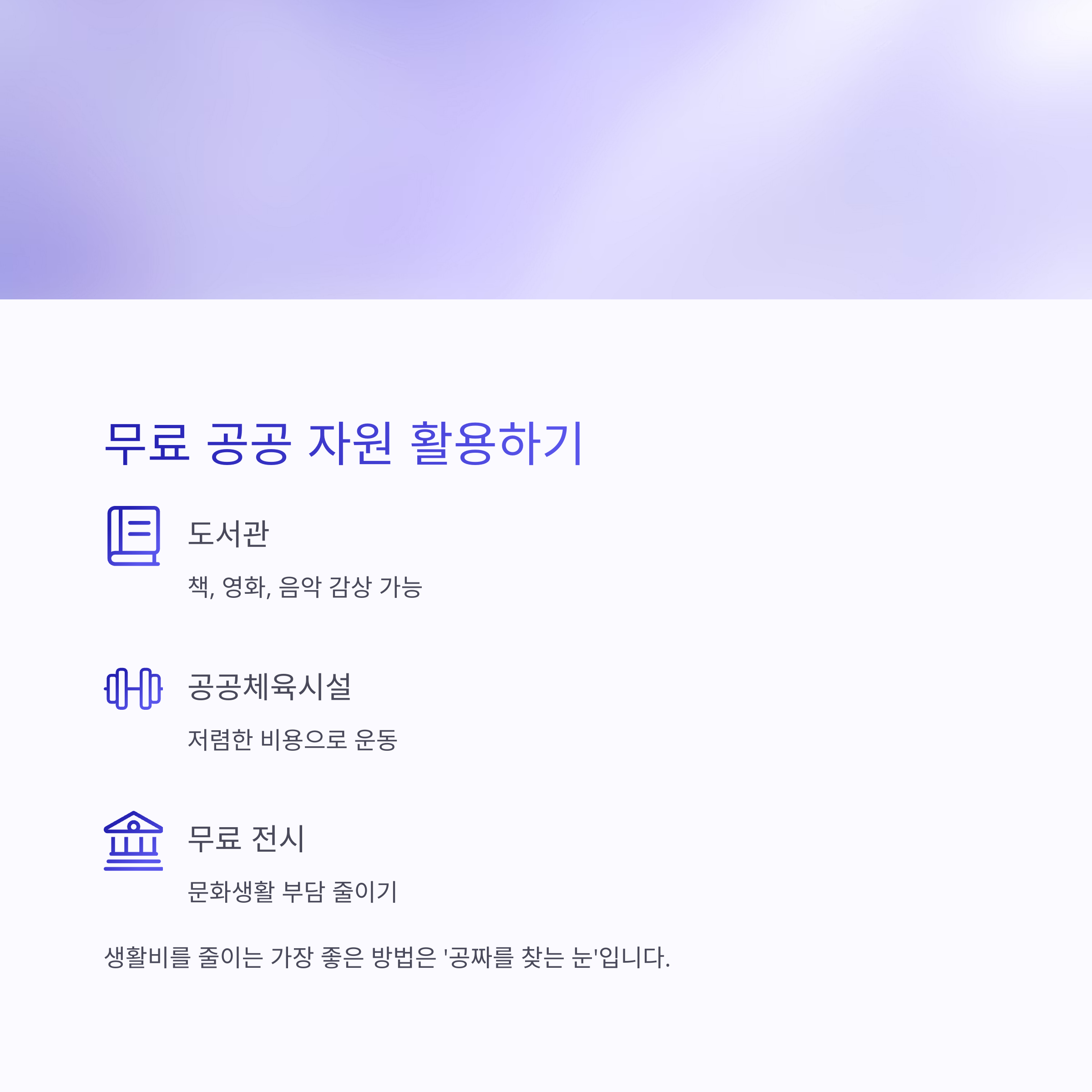 도서관, 구청 프로그램, 무료 전시, 커뮤니티 센터는 공짜로 얻을 수 있는 정보와 혜택의 보고입니다. 예를 들어, 동네 도서관에서는 책 대여뿐 아니라 영화, 음악 감상도 가능합니다. 운동도 헬스장 대신 공공체육시설을 이용하면 부담을 줄일 수 있습니다. 핵심: 생활비를 줄이는 가장 좋은 방법은 ‘공짜를 찾는 눈’입니다.