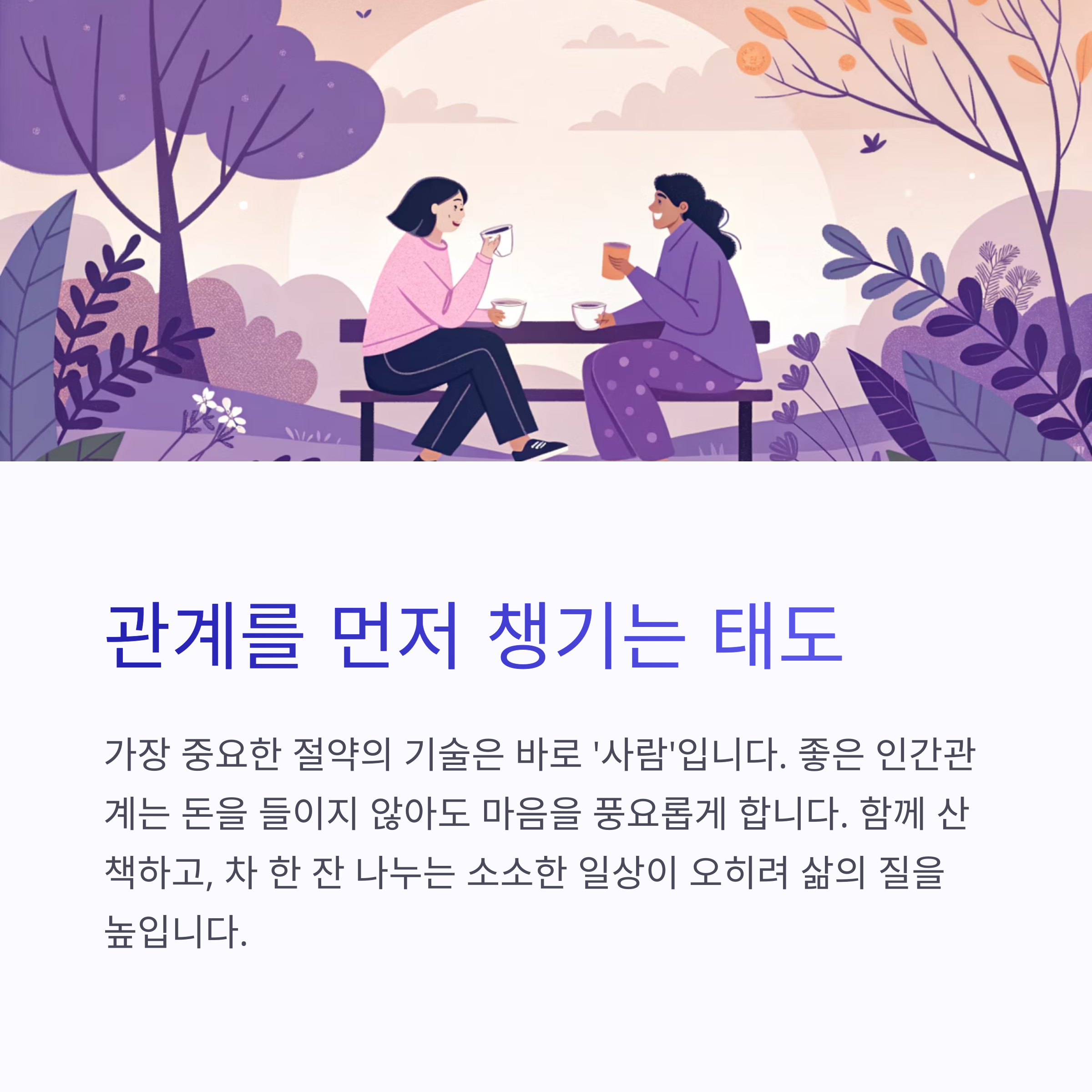 마지막이지만 가장 중요한 절약의 기술은 바로 '사람'입니다. 좋은 인간관계는 돈을 들이지 않아도 마음을 풍요롭게 합니다. 함께 산책하고, 차 한 잔 나누는 소소한 일상이 오히려 삶의 질을 높입니다. 절약은 고립이 아니라, 진짜 필요한 것에 집중하는 과정이어야 합니다.