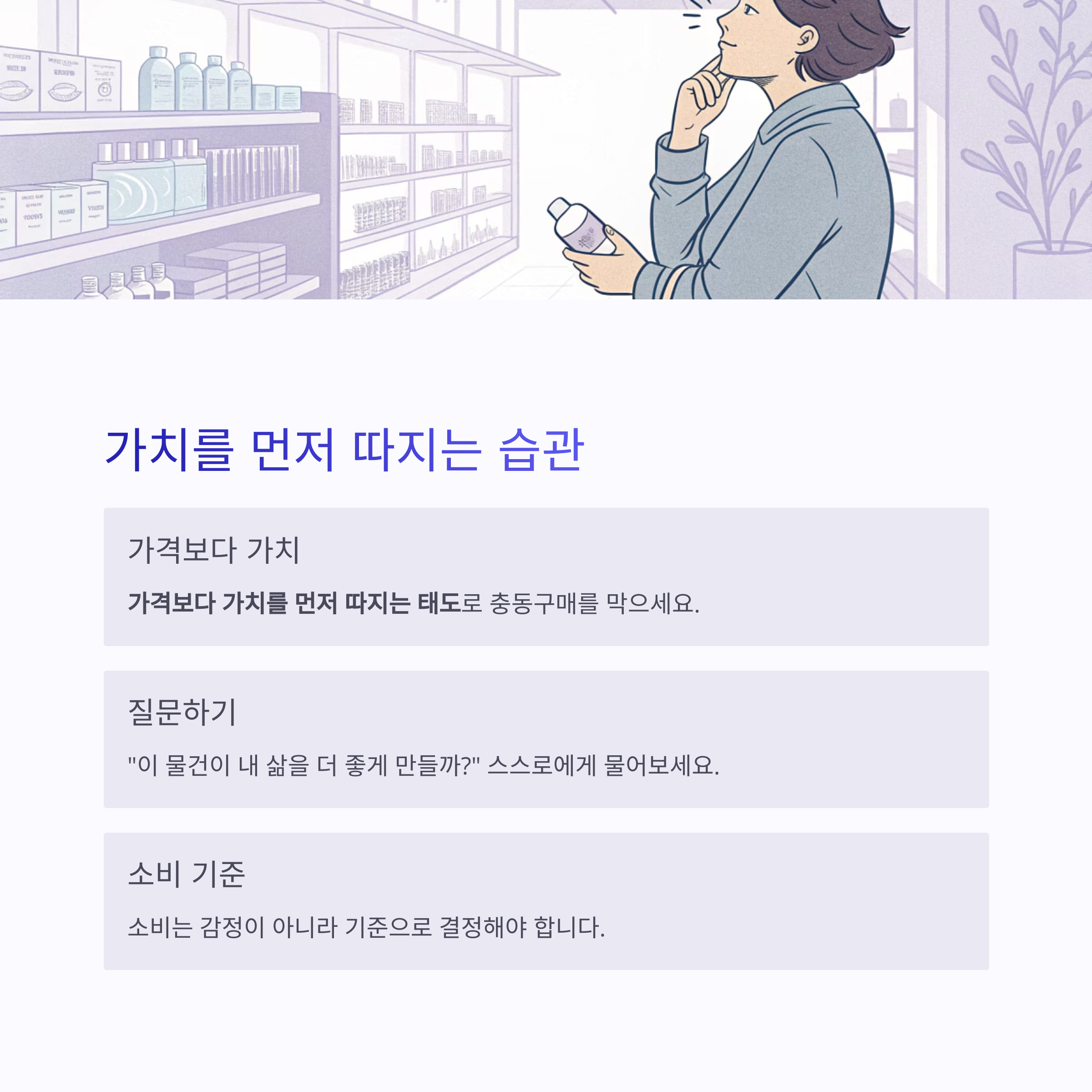 무언가를 구매할 때 ‘가격’보다 ‘가치’를 먼저 따지는 태도는 단기적인 충동구매를 막고, 장기적인 만족도를 높여줍니다. "이 물건이 내 삶을 더 좋게 만들까?"라는 질문을 스스로에게 던져보세요. 그 질문 하나만으로도 많은 불필요한 지출을 줄일 수 있습니다. 핵심: 소비는 감정이 아니라 기준으로 결정해야 합니다.