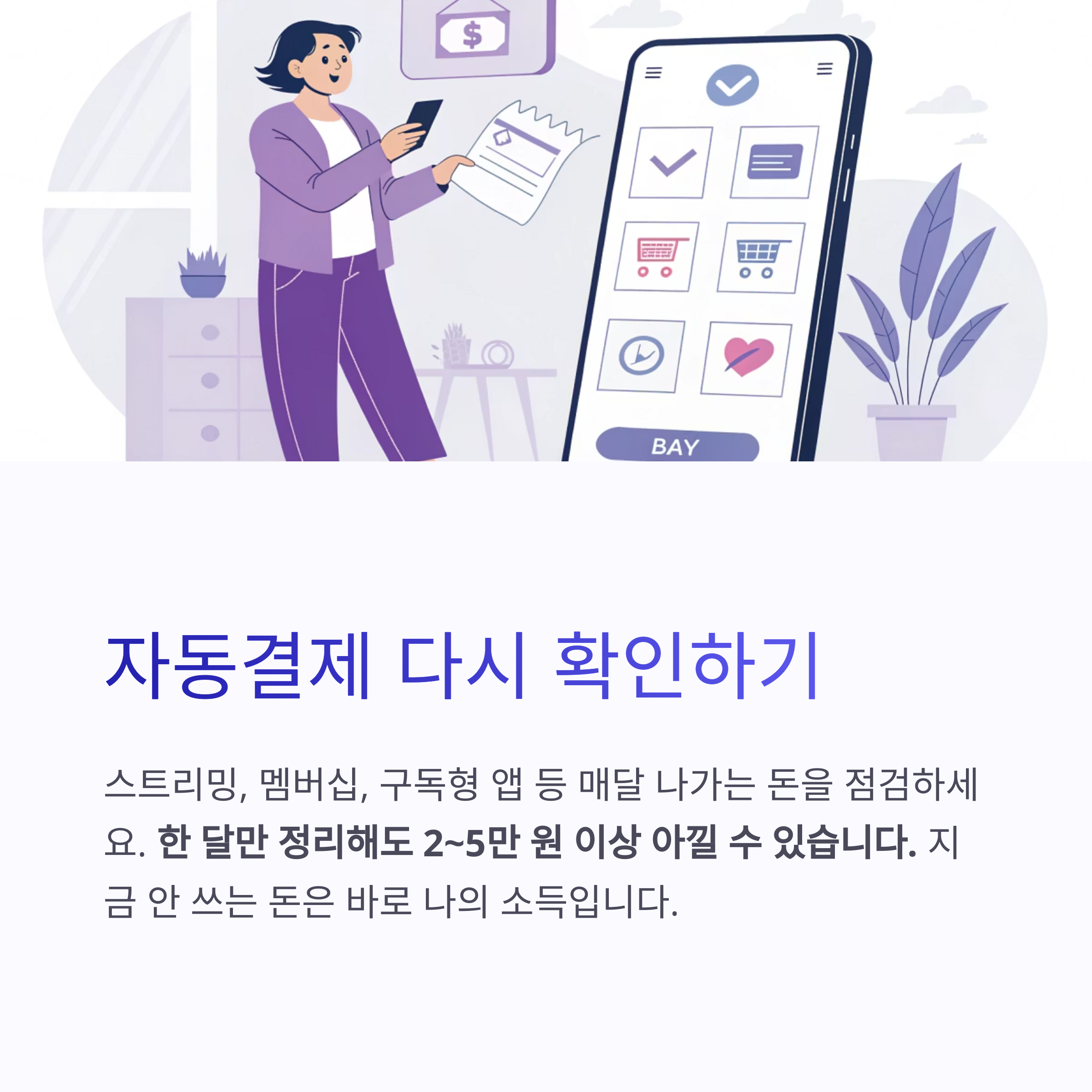 한 번 등록하고 나면 신경 쓰지 않게 되는 자동결제 서비스. 스트리밍, 멤버십, 구독형 앱 등 매달 나가는 돈을 다시 점검하세요. 한 달만 정리해도 2~5만 원 이상 아낄 수 있습니다. 실제로 필요 없는 항목을 취소하면 그 돈이 곧 여유 자금이 됩니다. "지금 안 쓰는 돈은 바로 나의 소득"이라는 말, 실감하게 됩니다.
