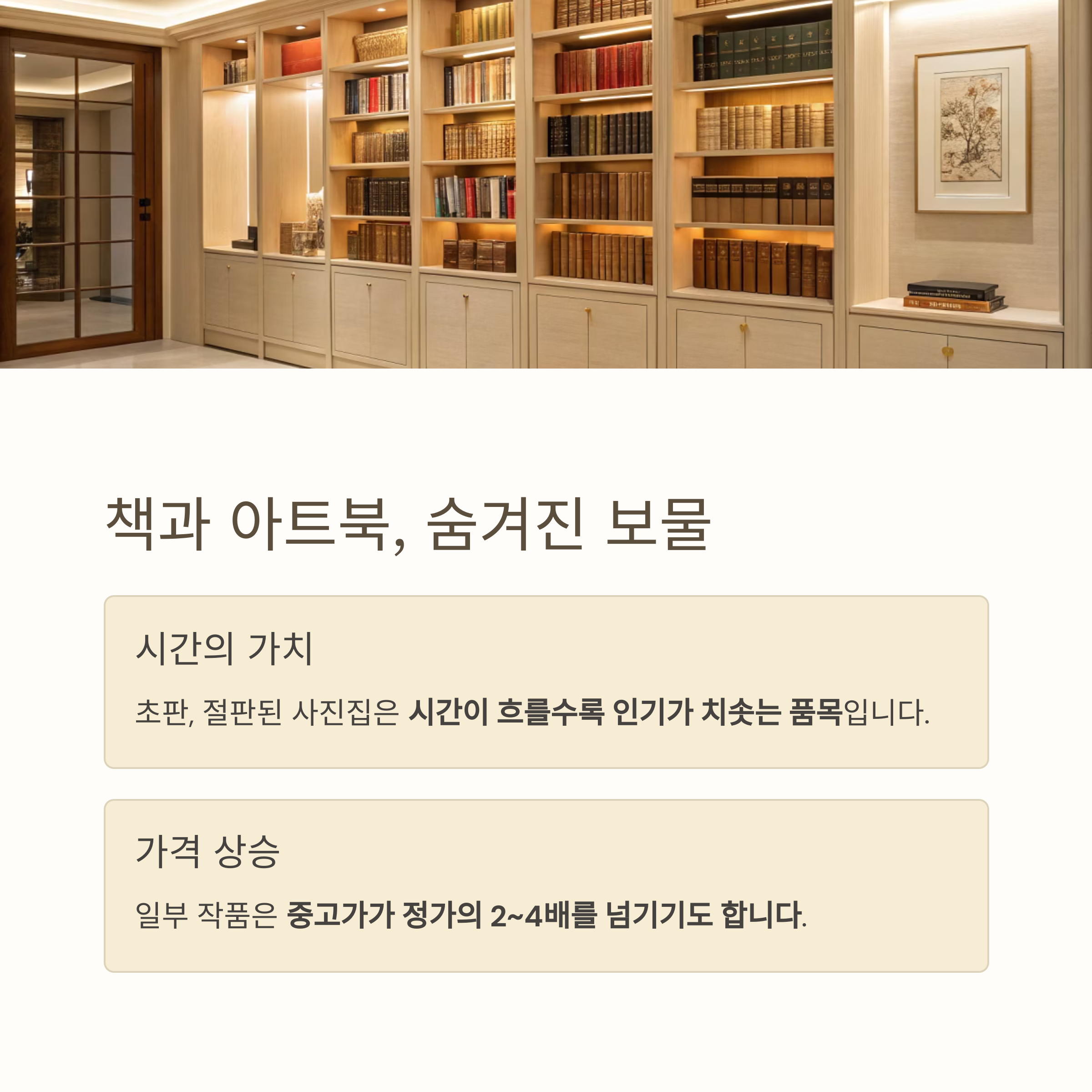 특정 작가의 초판, 절판된 사진집, 전시 아트북은 시간이 흐를수록 리셀 시장에서 인기가 치솟는 품목입니다. 일반 서적보다 가격 변동 폭이 크지 않지만, 일부 작품은 중고가가 정가의 2~4배를 넘기기도 합니다. 중요한 건 보관 상태와 초판 여부, 사인 유무입니다.