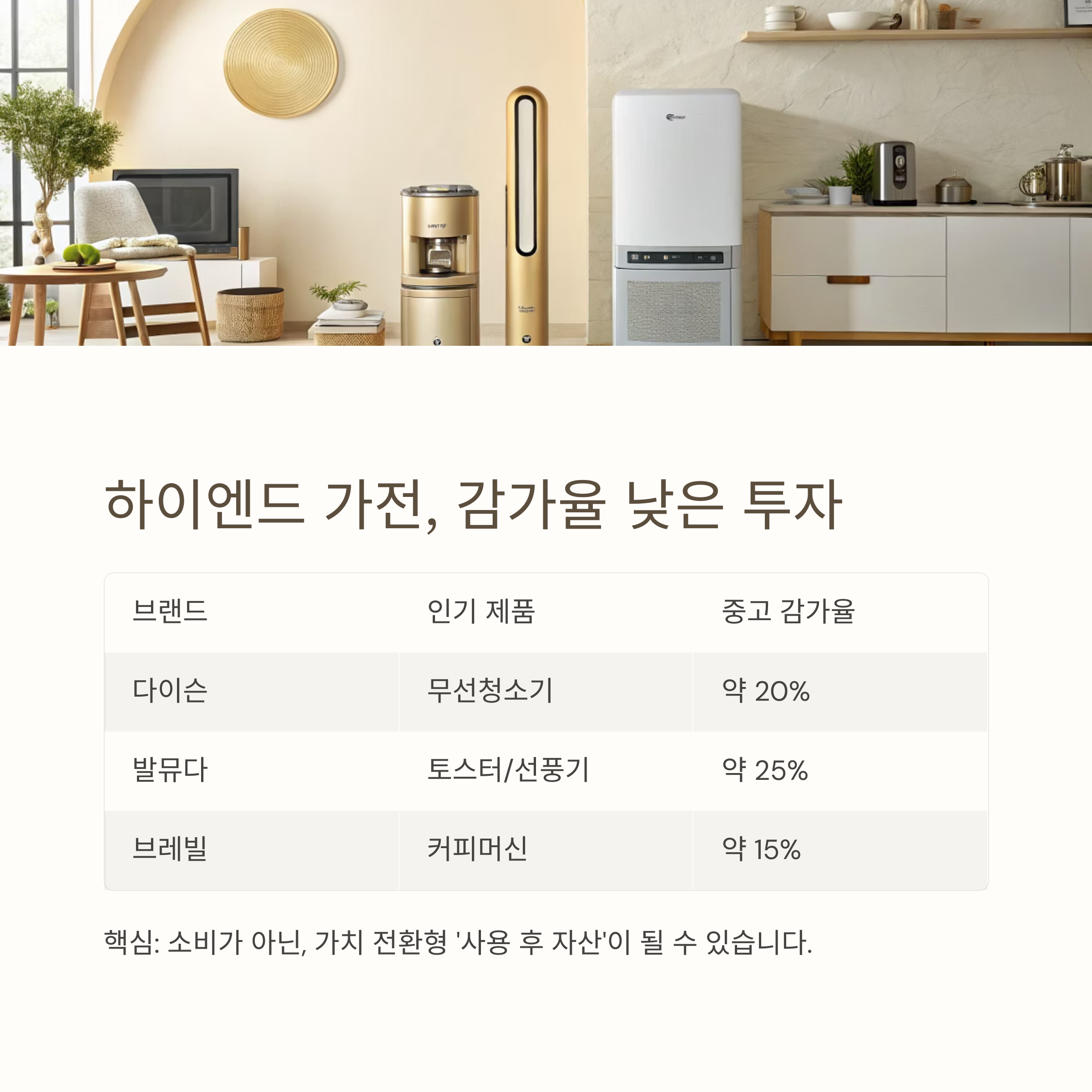 다이슨, 발뮤다, 브레빌 같은 고급 가전은 성능이 오래가고 브랜드 인지도도 높기 때문에 중고 시장에서 인기가 높습니다. 1~2년만 써도 신제품 대비 30% 저렴한 가격에 구입 가능하며, 잘 관리하면 다시 팔 때도 10~20% 감가로 재판매가 가능합니다.