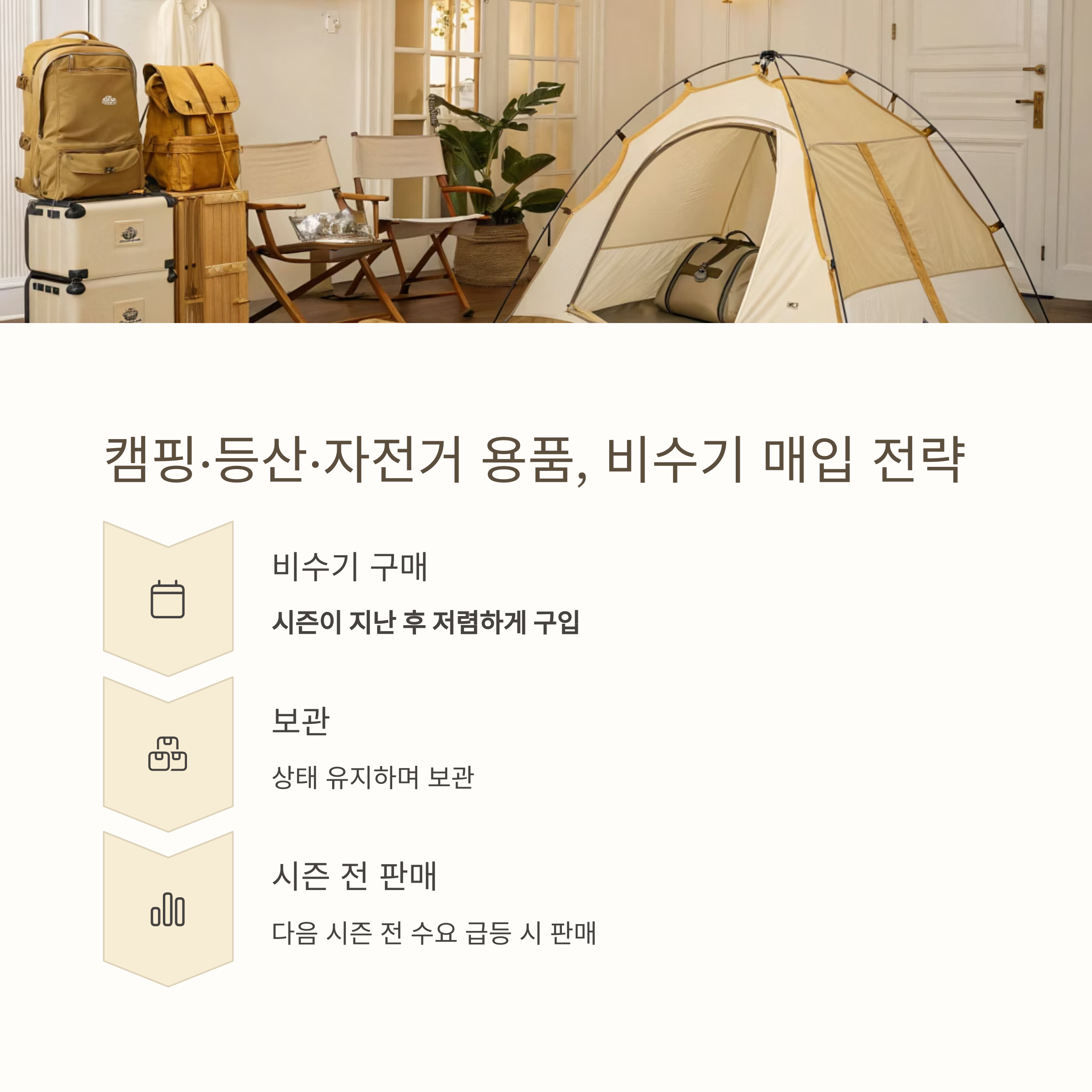 캠핑·등산·자전거 용품, 계절 지난 후 매입이 전략