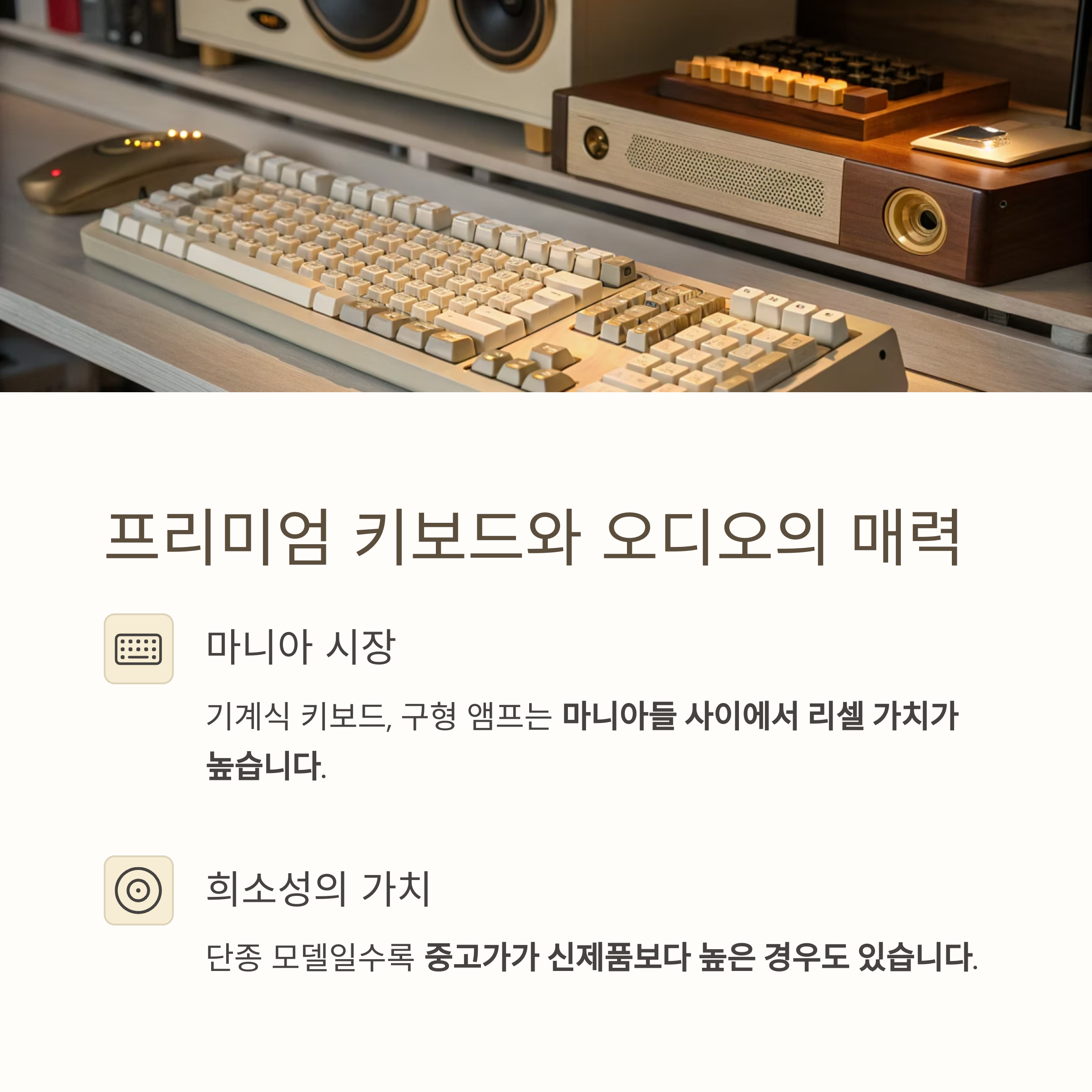체리 MX 스위치 기반 기계식 키보드, 구형 오디오 앰프, LP 플레이어는 마니아들 사이에서 리셀 가치가 높은 품목입니다. 단종 모델이나 해외 직구 제품일수록 희소성이 높고, 오히려 중고가가 신제품보다 높은 경우도 있습니다. 기기류는 사용감보다 보관 상태와 작동 여부가 핵심 요소로 작용합니다.