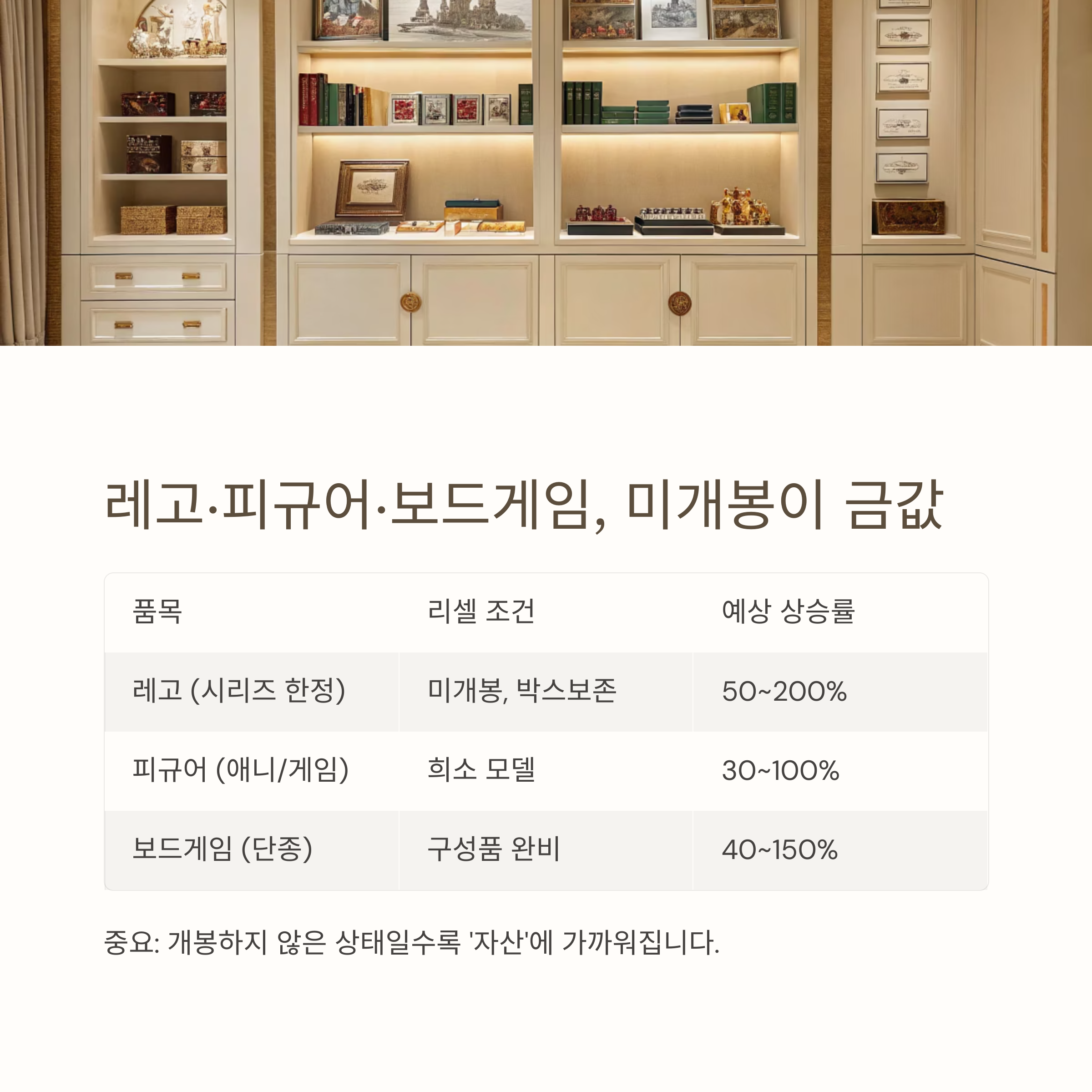 레고의 특정 시리즈, 한정판 피규어, 클래식 보드게임은 개봉하지 않은 새 상품에 가까울수록 리셀 가치가 급상승합니다. 특히 어린이용 제품으로 시작해 수집품으로 진화한 경우가 많아, 오히려 시간이 지나도 인기가 줄지 않습니다.