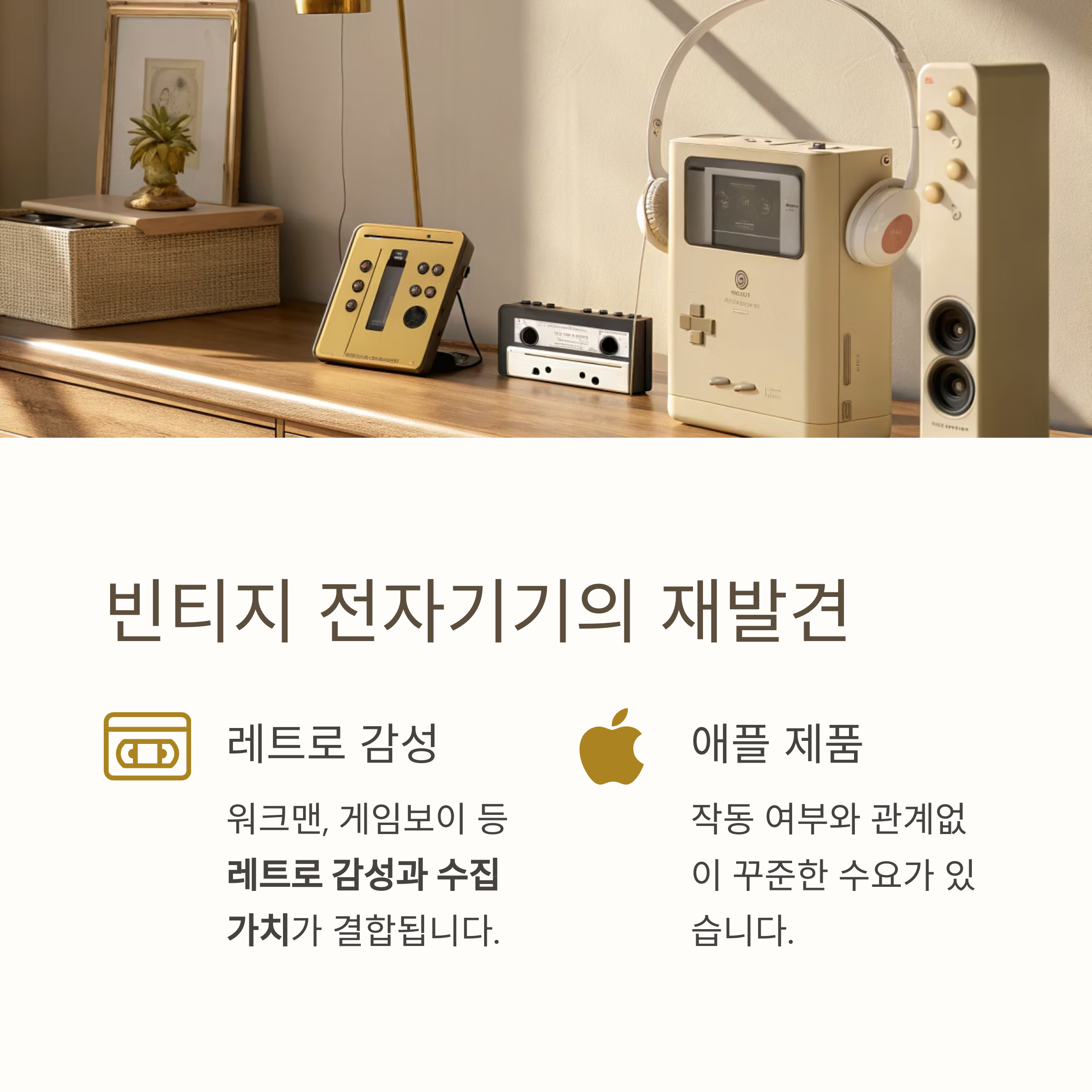 예전 CD플레이어, 아이팟 클래식, 워크맨, 게임보이 등은 레트로 감성과 수집 가치가 결합되면서 다시 주목받고 있습니다. 특히 애플 제품은 작동 여부와 관계없이 꾸준한 수요가 있습니다. 1990~2000년대 전자기기는 수량이 줄어들고 있기 때문에, 지금 매입해두면 향후 더 높은 리셀 가치를 기대할 수 있습니다.