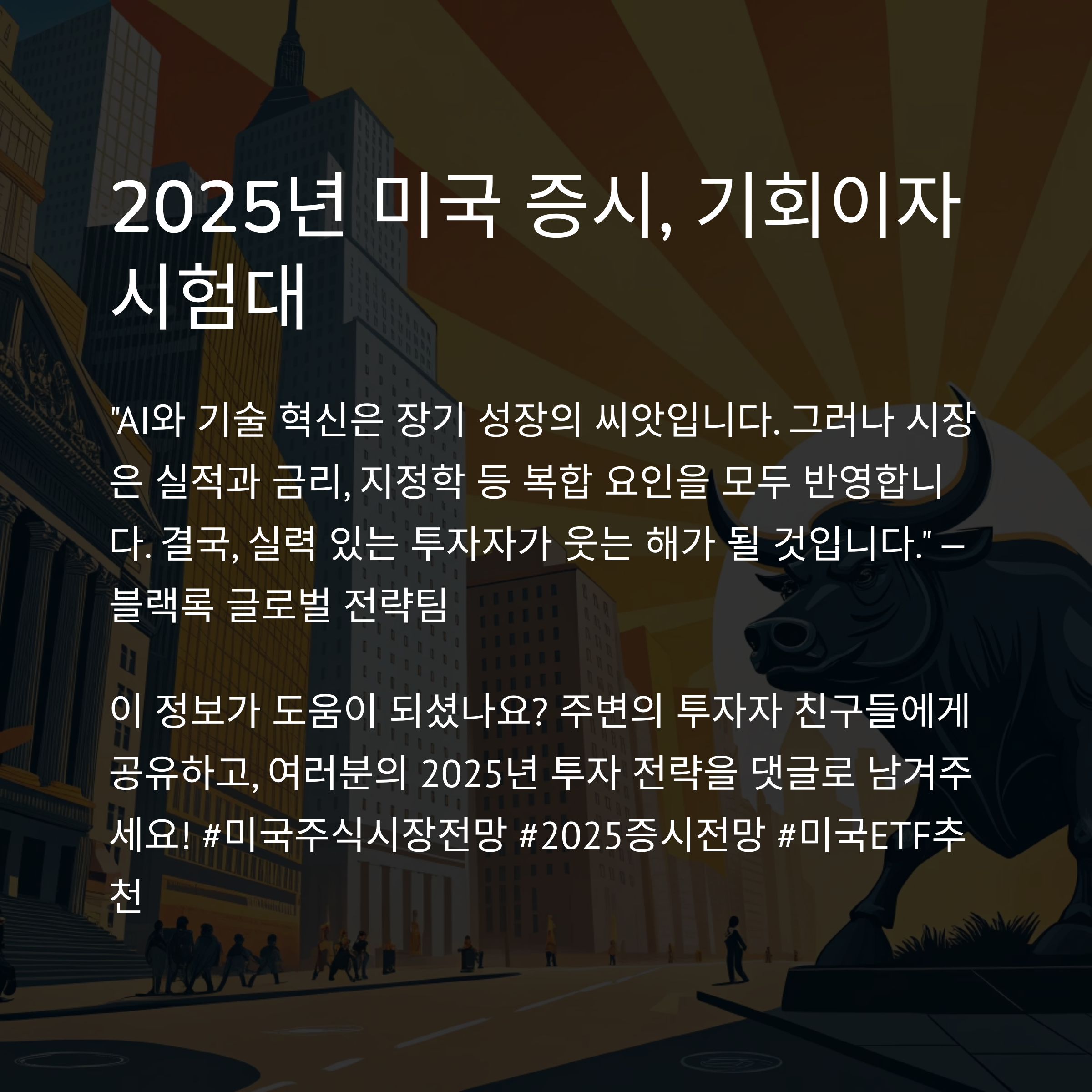 "AI와 기술 혁신은 장기 성장의 씨앗입니다. 그러나 시장은 실적과 금리, 지정학 등 복합 요인을 모두 반영합니다. 결국, 실력 있는 투자자가 웃는 해가 될 것입니다." — 블랙록 글로벌 전략팀
