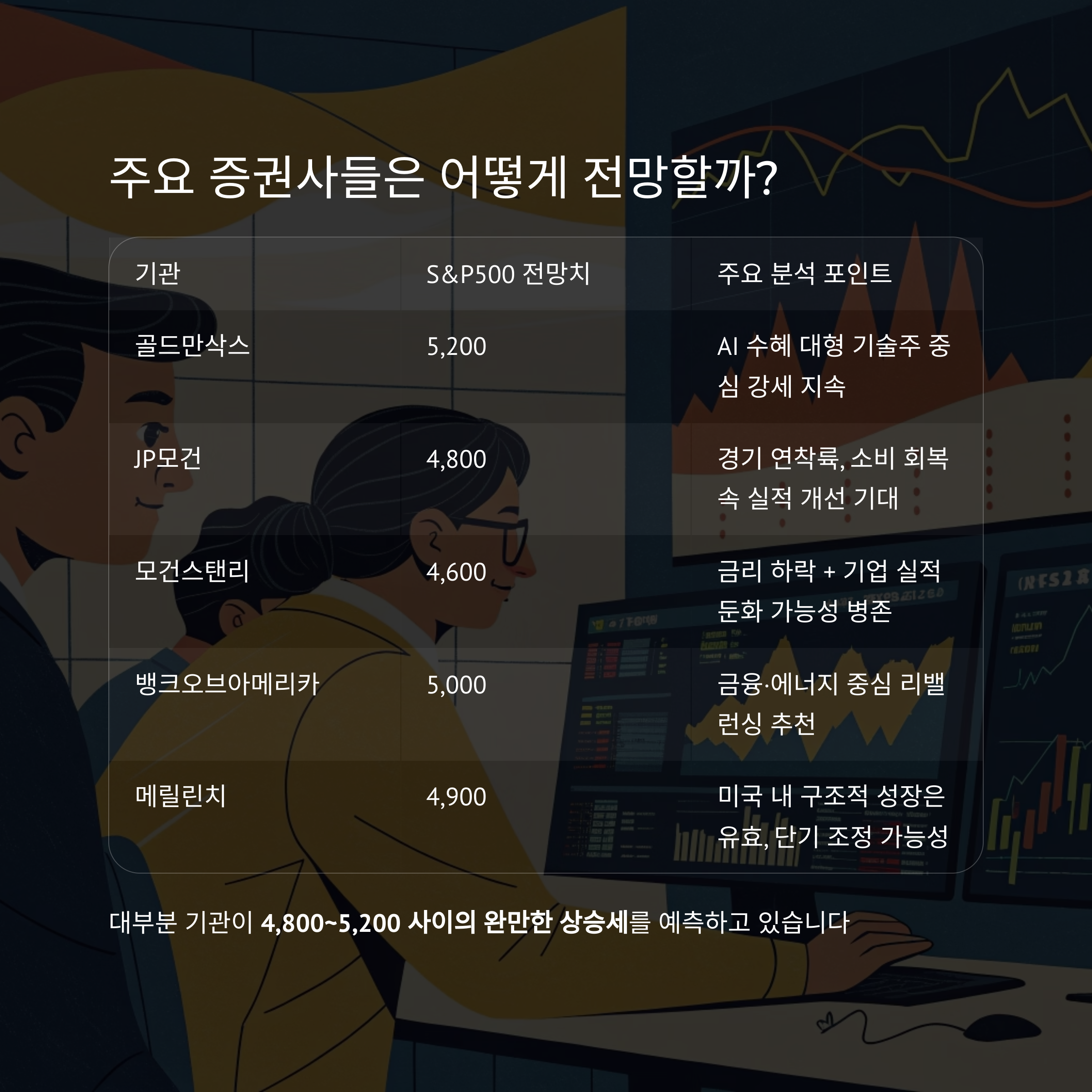 대부분 기관이 4,800~5,200 사이의 완만한 상승세를 예측하고 있습니다