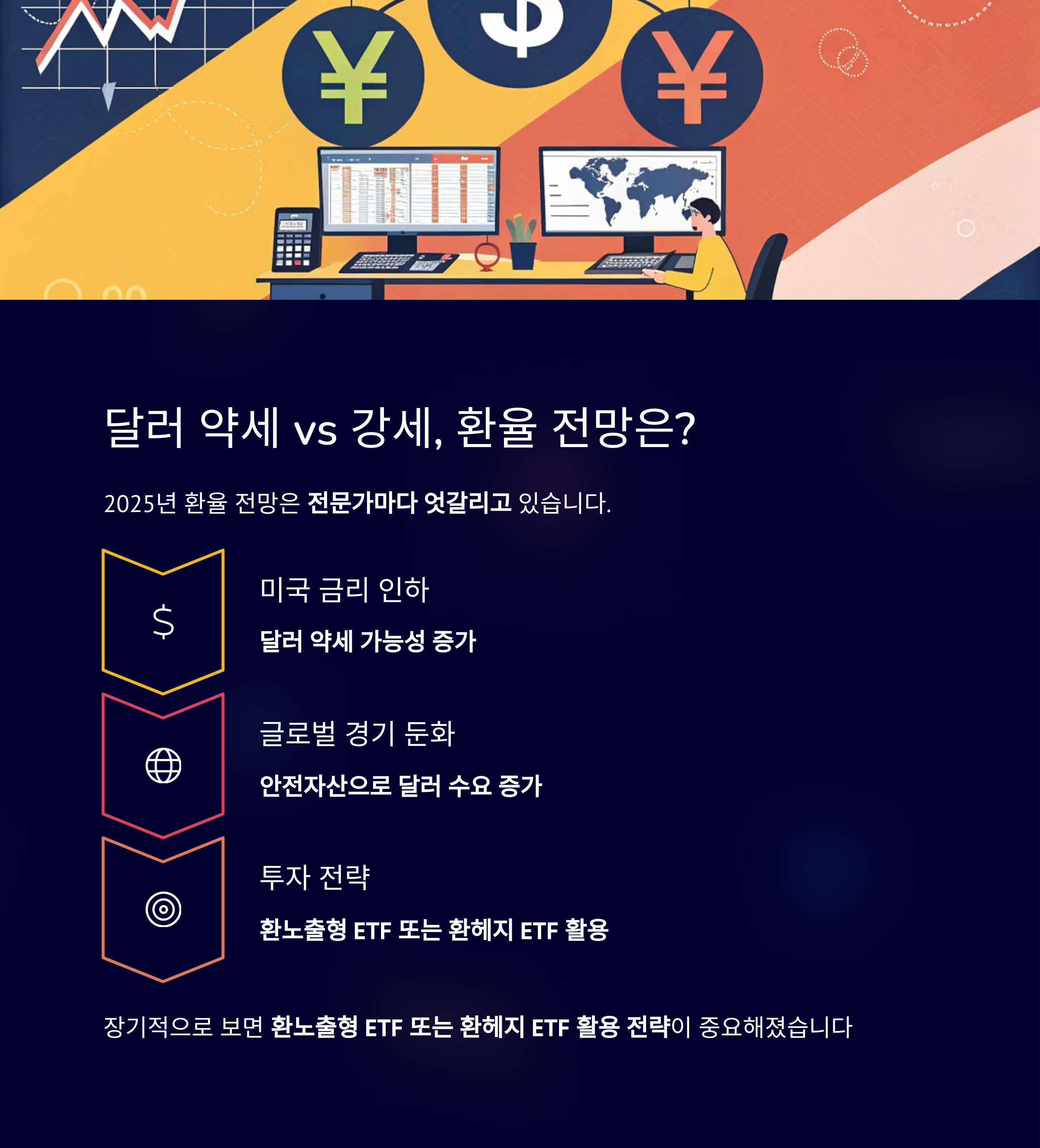 환노출형 ETF 또는 환헤지 ETF 전략이 중요해졌습니다