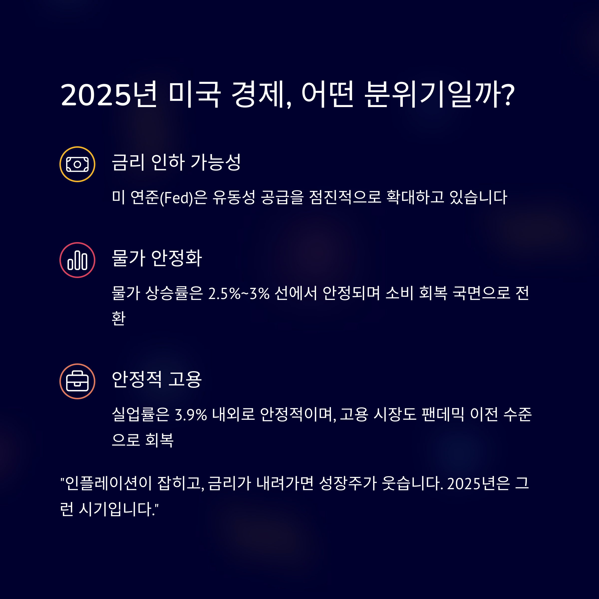 "인플레이션이 잡히고, 금리가 내려가면 성장주가 웃습니다. 2025년은 그런 시기입니다."