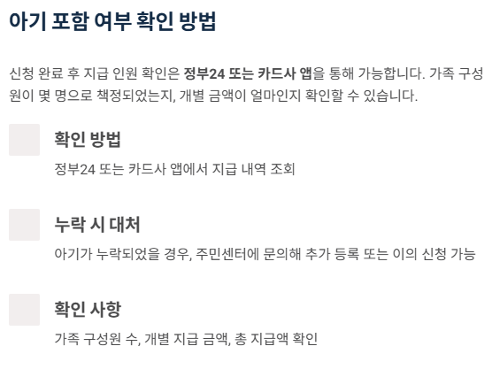 신청 완료 후 지급 인원 확인은 정부24 또는 카드사 앱을 통해 가능하며,