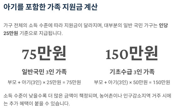 | 부모 + 아기 (3인) | 일반국민 | 25만원 x 3 = 75만원 |