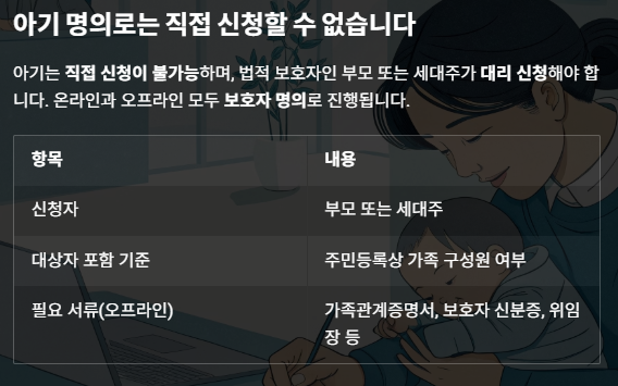 법적 보호자인 부모 또는 세대주가 대리 신청해야 하며,