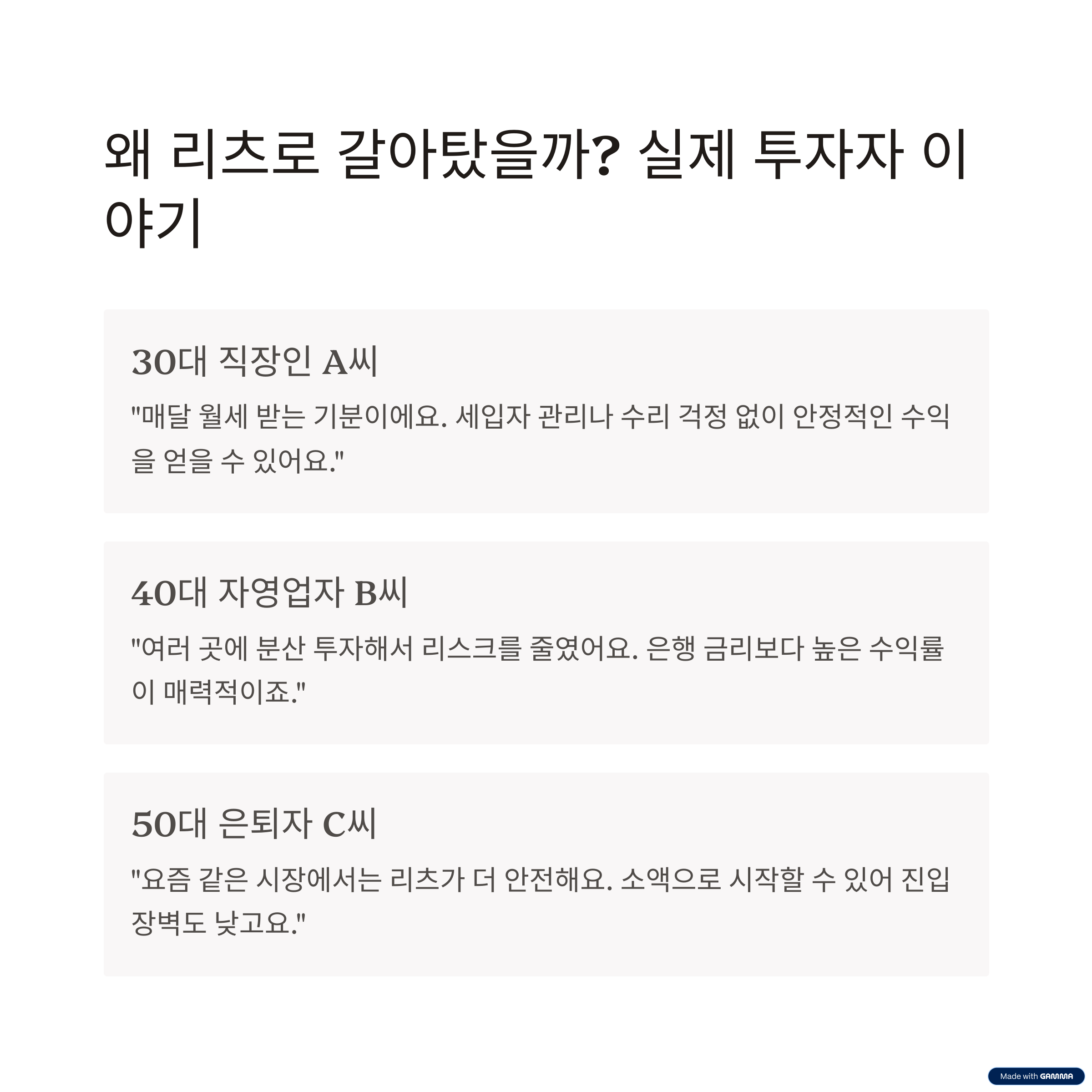 많은 투자자들이 "직접 부동산을 관리하지 않아도 되는 점"과