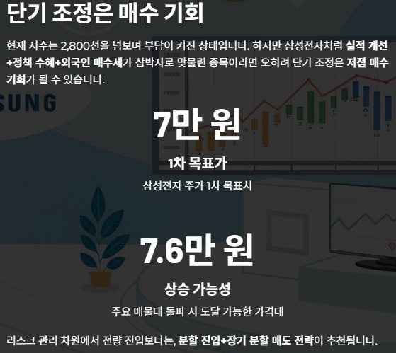 - 삼성전자는 단기 급등 종목이 아닙니다. 지금은 장기적 관점에서 포지션을 점검해야 할 시점입니다.