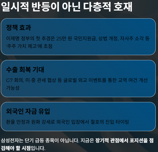 삼성전자의 최근 상승은 단순한 기술적 반등이 아닙니다. 다음과 같은 ‘다층적 호재’가 뒷받침되고 있습니다.