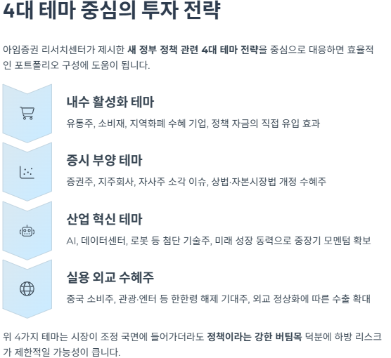아임증권 리서치센터가 제시한 새 정부 정책 관련 4대 테마 전략을 중심으로 대응하면 효율적인 포트폴리오 구성에 도움이 됩니다.