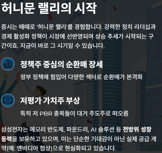 증시는 때때로 ‘허니문 랠리’를 경험합니다. 강력한 정치 리더십과 경제 활성화 정책이 시장에 선반영되며 상승 추세가 시작되는 구간이죠. 지금이 바로 그 시기일 수 있습니다.