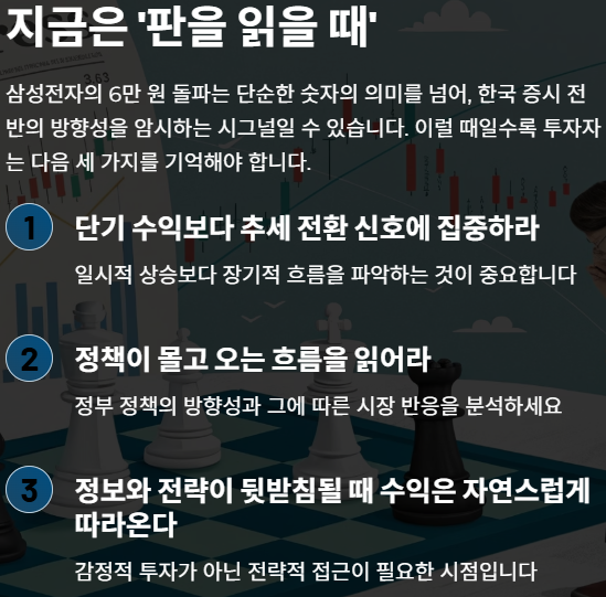 삼성전자의 6만 원 돌파는 단순한 숫자의 의미를 넘어, 한국 증시 전반의 방향성을 암시하는 시그널일 수 있습니다. 이럴 때일수록 투자자는 다음 세 가지를 기억해야 합니다.