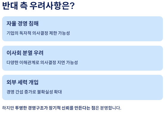 일각에서는 기업의 자율 경영을 침해할 수 있다는 비판도 존재합니다.
