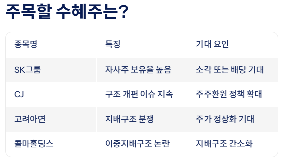 | SK그룹 | 자사주 보유율 높음 | 소각 또는 배당 기대 |