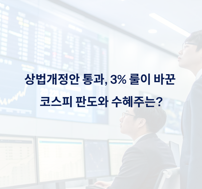 2025년 상법개정안이 국회를 통과하면서 '3% 룰'이 본격적으로 시행됩니다. 이 제도 변화는 코스피 시장에 구조적인 변화를 일으키며, 지배구조 개선과 주주 친화 경영이라는 큰 흐름을 형성하고 있습니다. 특히 특정 기업군이 직접적인 수혜를 입을 것으로 예상되며, 투자자들의 관심이 쏠리고 있습니다.