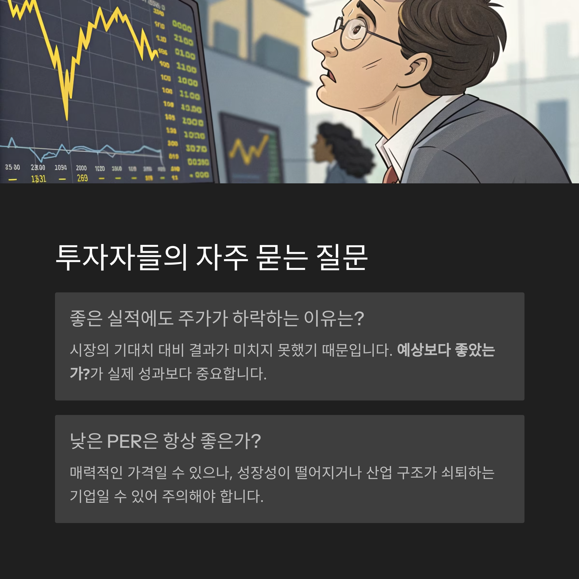 "실적이 좋아도 주가가 빠지는 이유는 뭔가요?"
