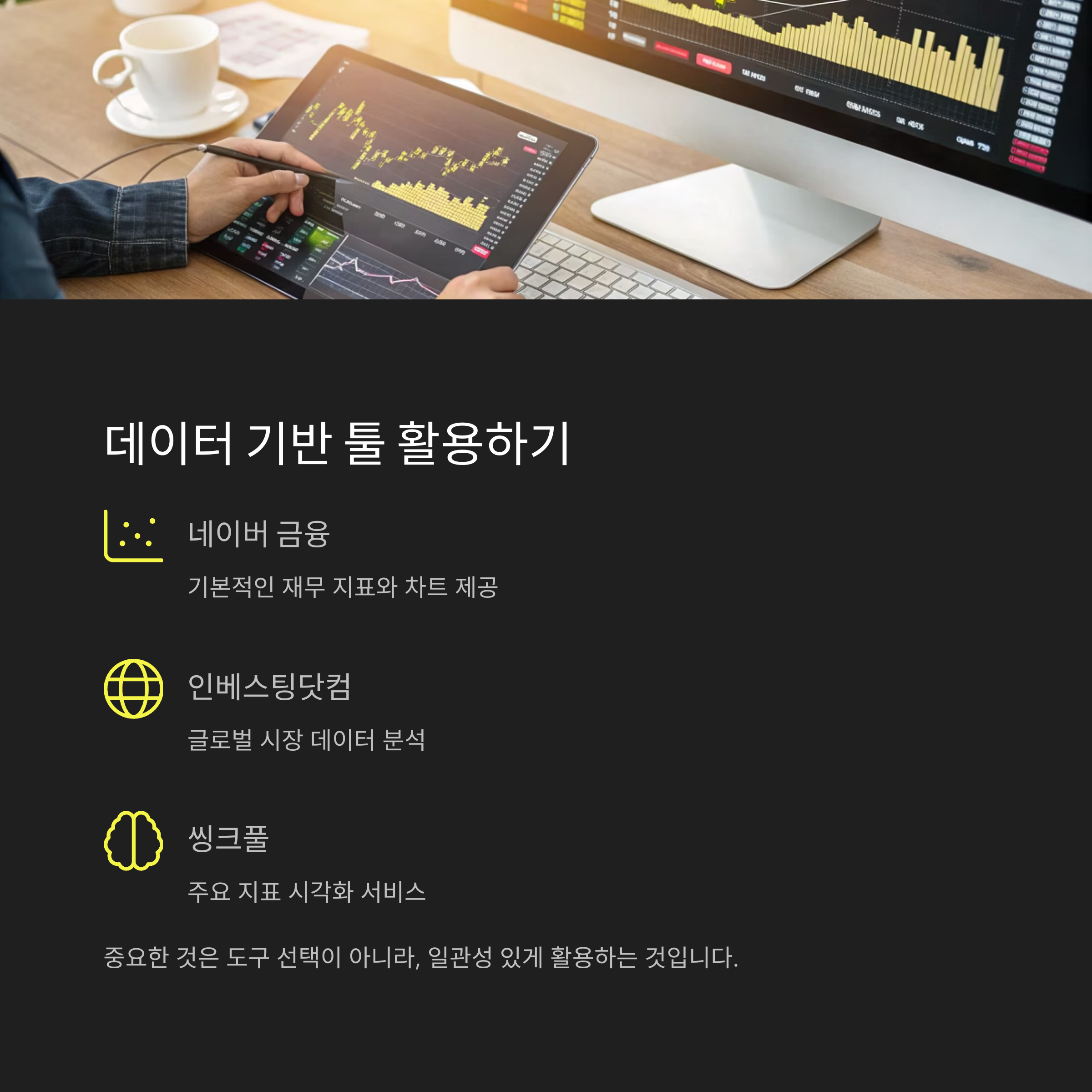 최근에는 개인 투자자도 무료 또는 저렴한 비용으로 다양한 분석 툴을 사용할 수 있습니다. 네이버 금융, 인베스팅닷컴, 씽크풀 등은 주요 지표를 시각화하여 보여줍니다. 중요한 것은 도구를 '선택'하는 것이 아니라, '일관성 있게' 활용하는 것입니다. 데이터는 도구일 뿐, 최종 판단은 투자자 본인의 몫입니다.