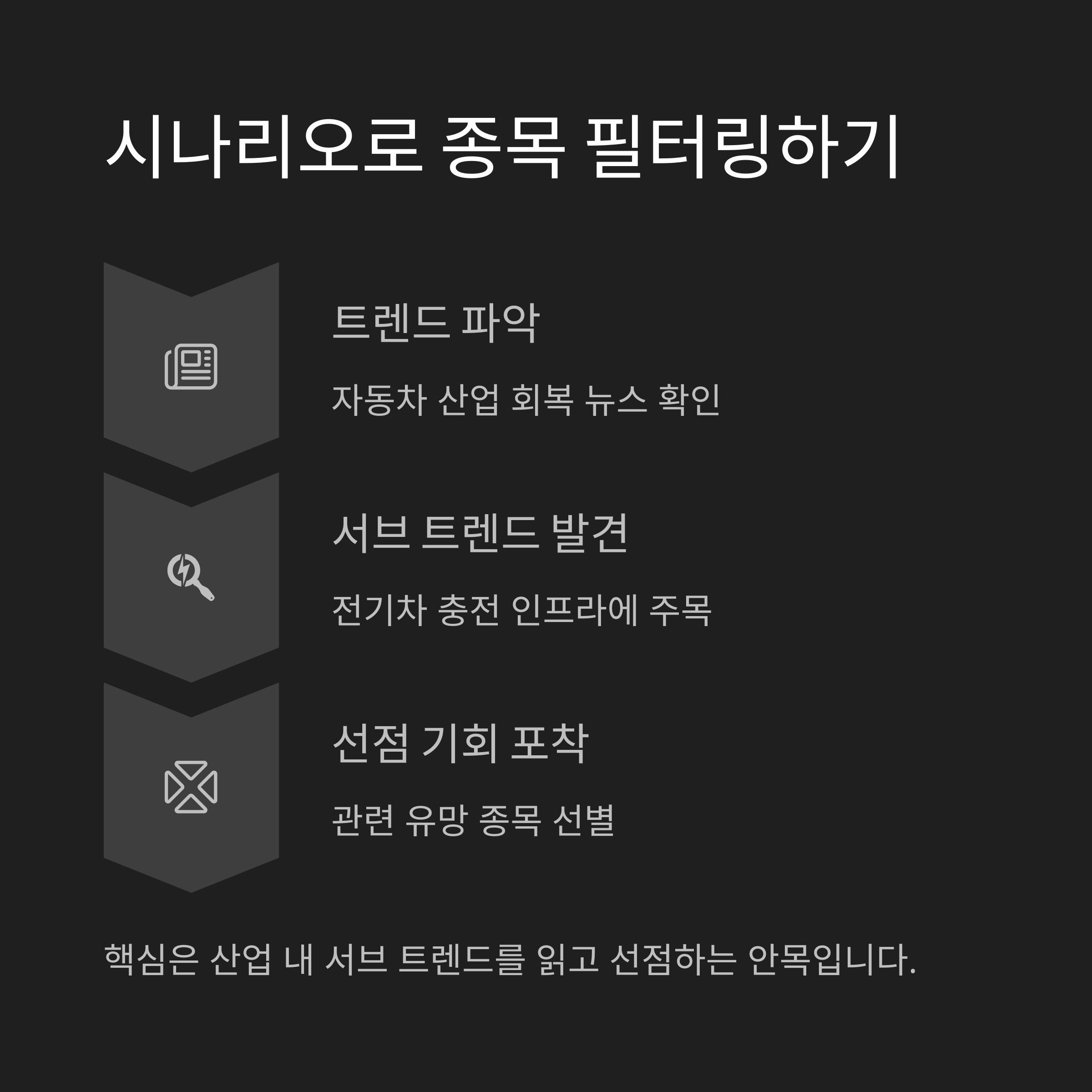 상황극 예시로 이해해봅니다. A 투자자는 자동차 산업이 회복된다는 뉴스를 듣고 관련 종목을 찾습니다. 하지만 단순 자동차 제조가 아닌, 전기차 충전 인프라 업체에 주목합니다. 핵심은 '산업 내 서브 트렌드'를 읽고 선점하는 안목입니다.