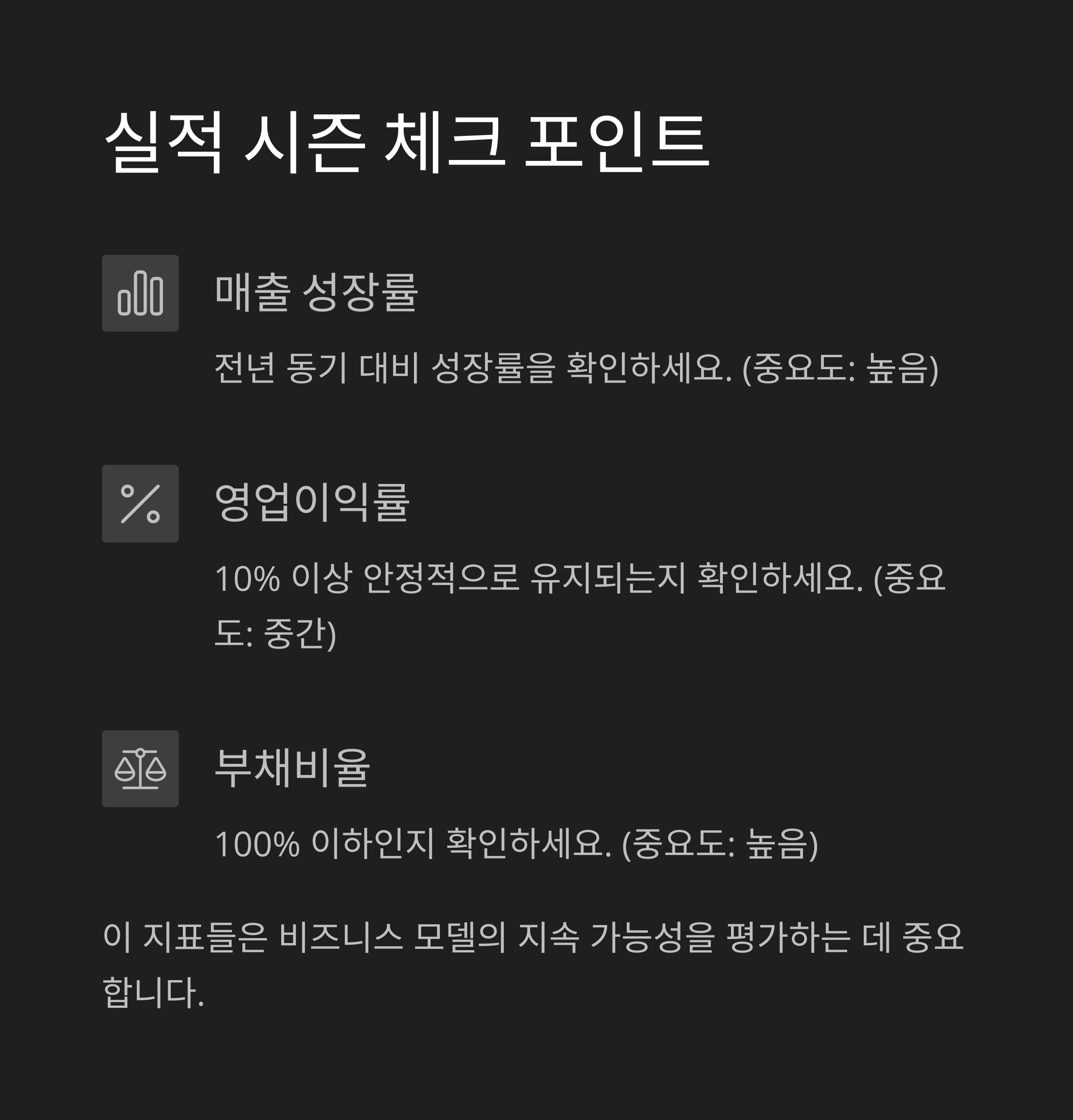 | 매출 성장률 | 전년 동기 대비 성장률 확인 | 높음 |