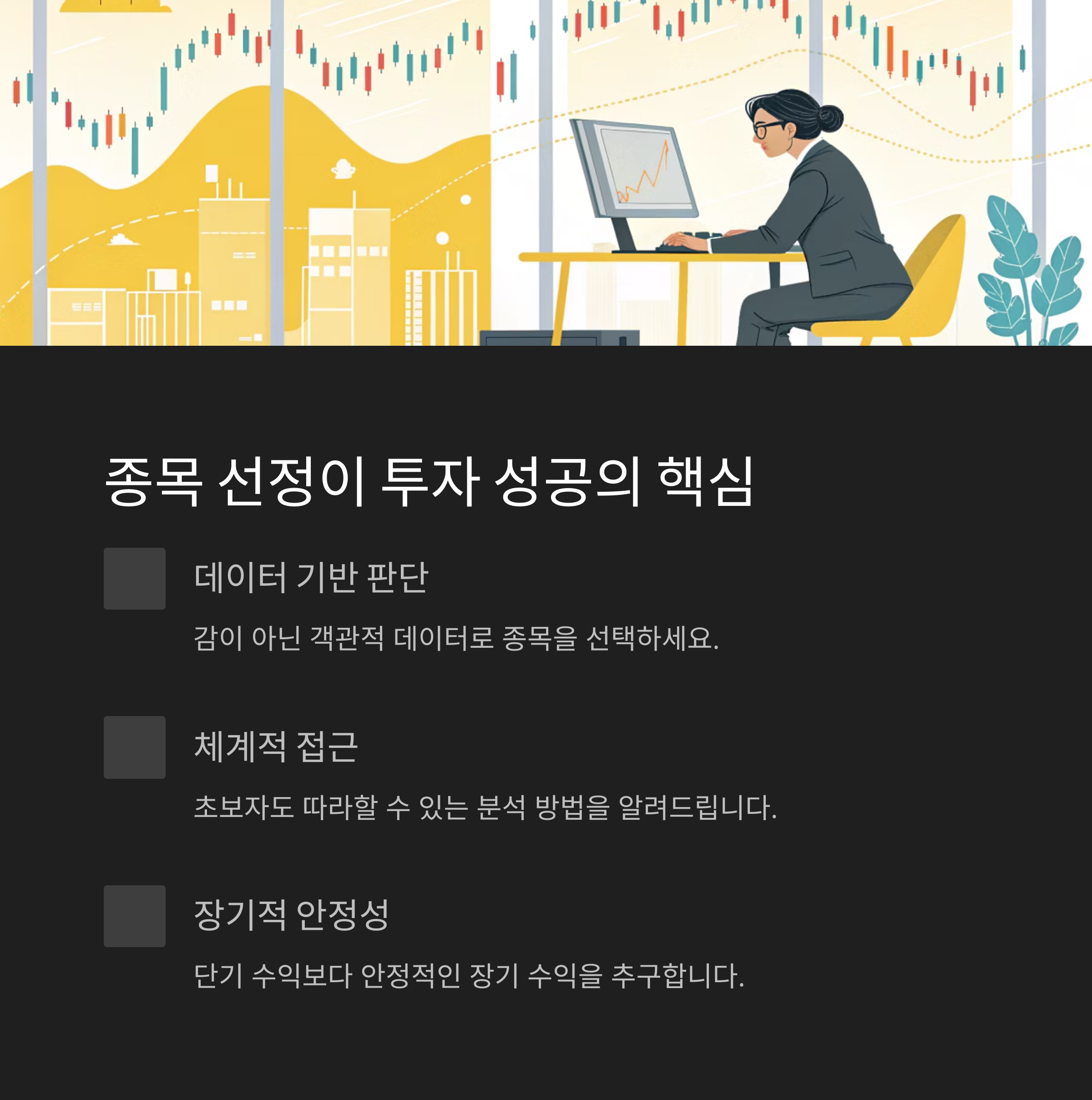 성공적인 주식투자의 핵심은 바로 종목 선정 능력에 있습니다. 이 글에서는 초보자도 따라할 수 있는 종목 분석 방법부터, 실패 확률을 줄이는 전략적 접근까지 체계적으로 정리해드립니다. 특히 감이 아닌 데이터 기반의 판단 방식을 강조하며, 장기적으로 안정적인 수익을 추구하는 데 목적을 두고 있습니다.