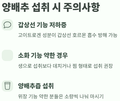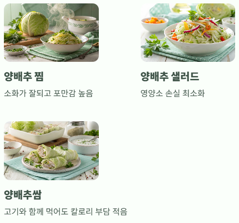 | 양배추 샐러드 | 생으로 섭취하여 영양소 손실 최소화 |