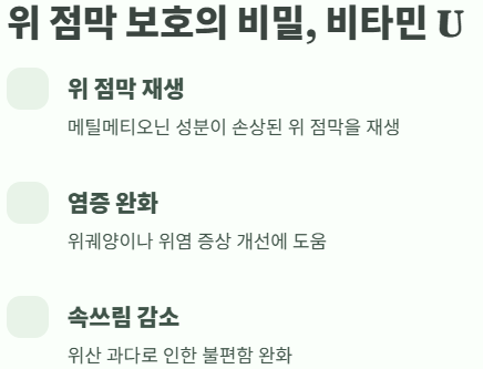 | 비타민 U | 위 점막 재생, 염증 완화 |