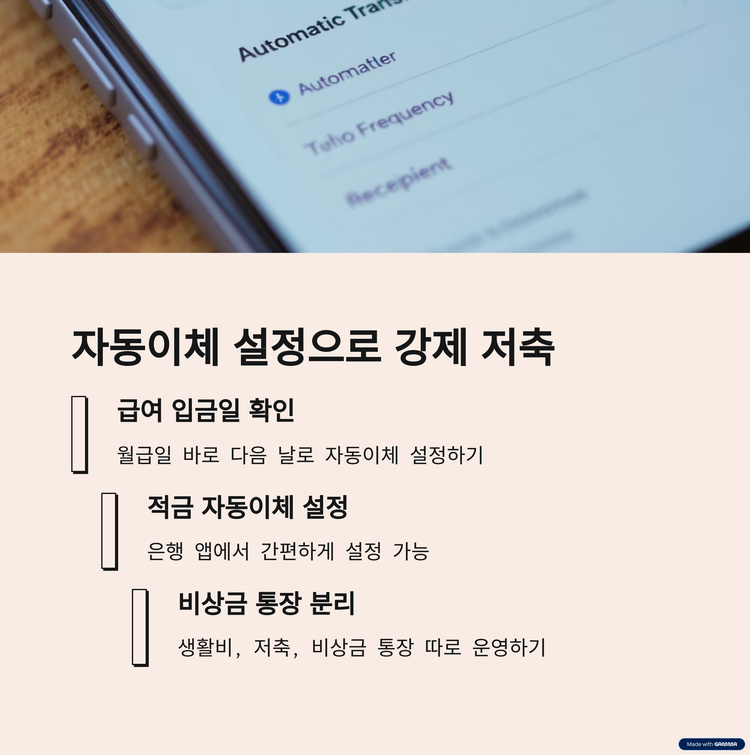 급여일 다음 날로 자동이체를 설정하면 "돈을 쓰기 전에 저축"하는 구조가 완성됩니다.