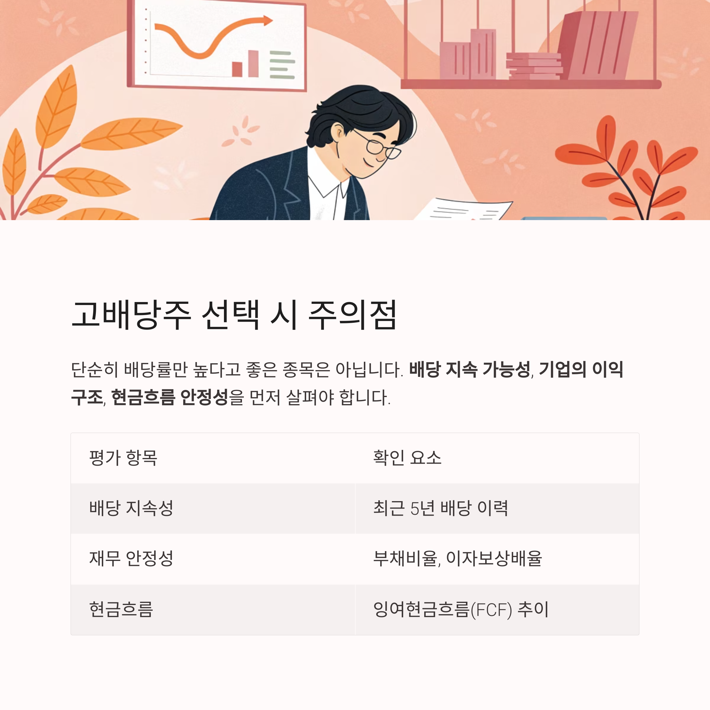 배당 지속 가능성, 기업의 이익 구조, 현금흐름 안정성 등을 먼저 살펴야 합니다.