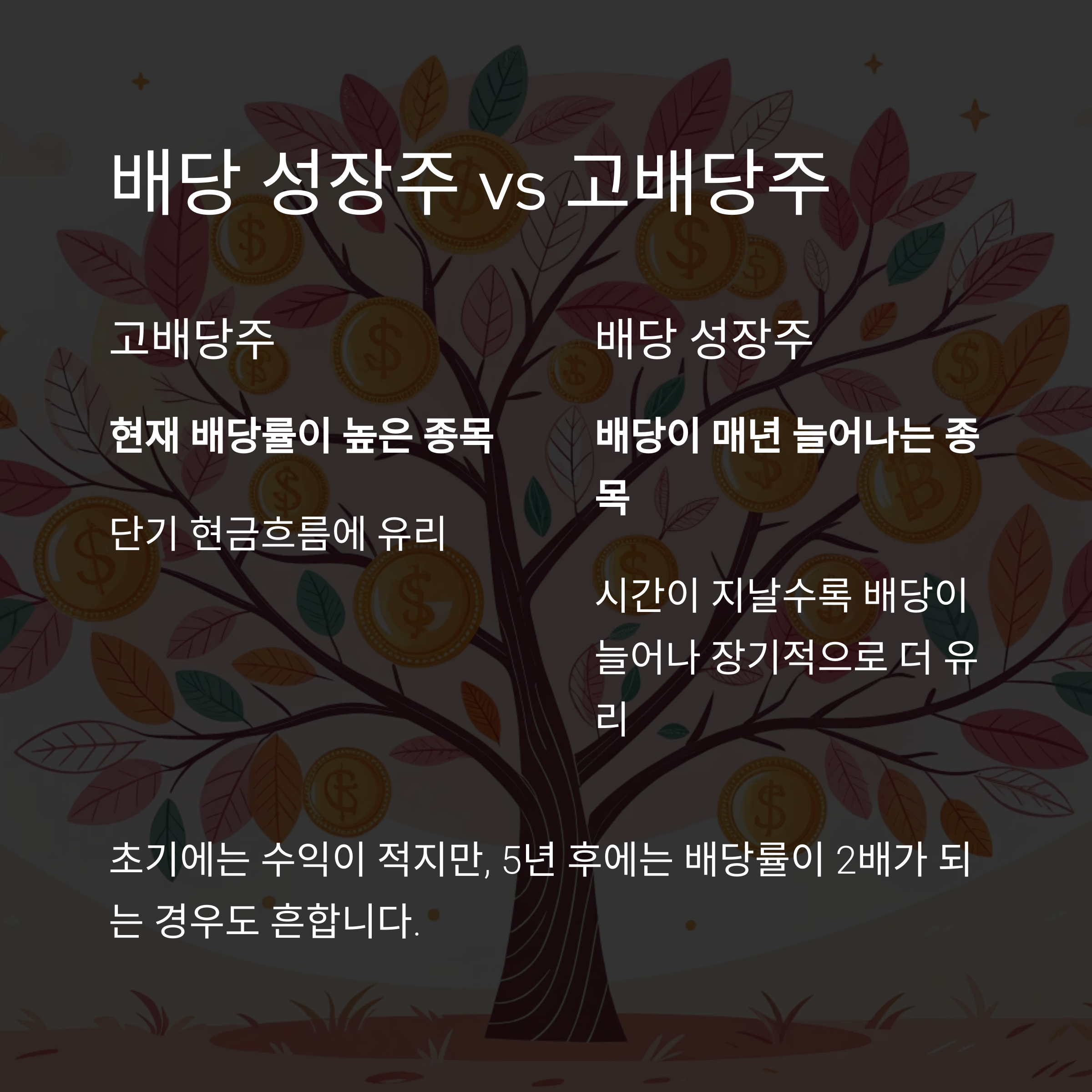 단기 수익보다는 시간이 지날수록 배당이 늘어나는 성장형 배당주에 장기 투자하는 전략이 더 유리할 수 있습니다.
