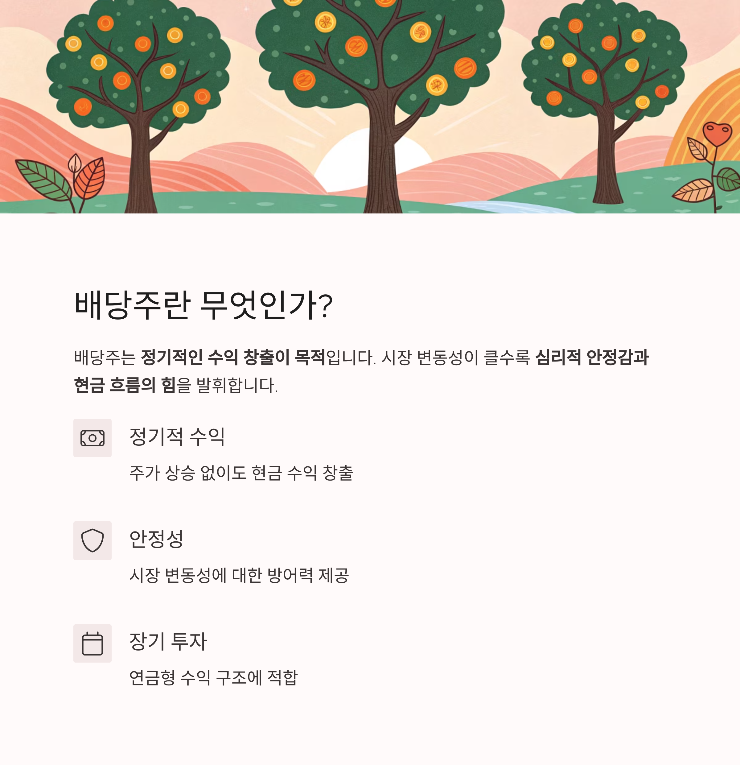 주가 상승 없이도 수익을 낼 수 있기 때문에 장기적 안정성과 연금형 수익에 적합합니다.