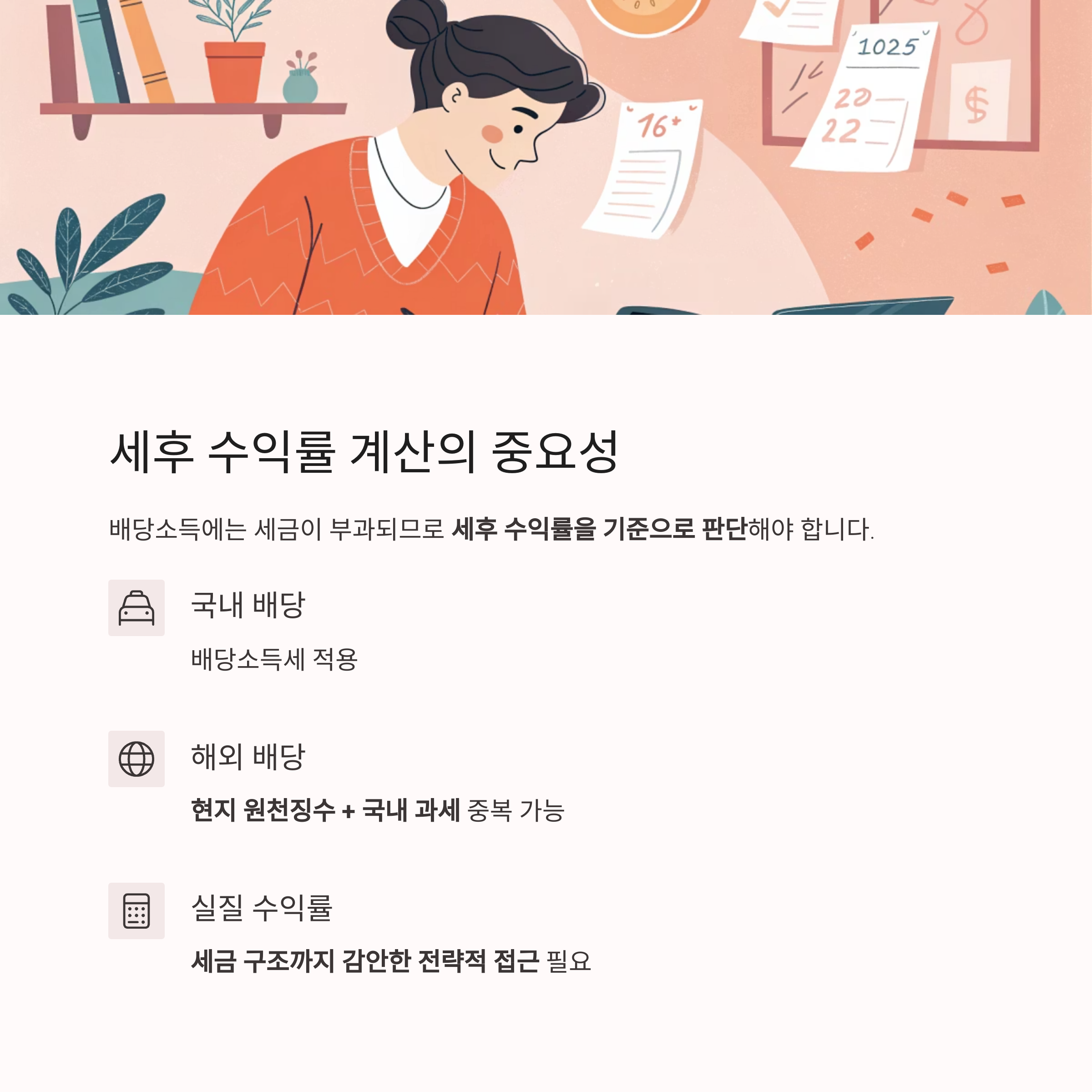 배당소득에는 세금이 부과되므로 세후 수익률을 기준으로 판단해야 합니다.